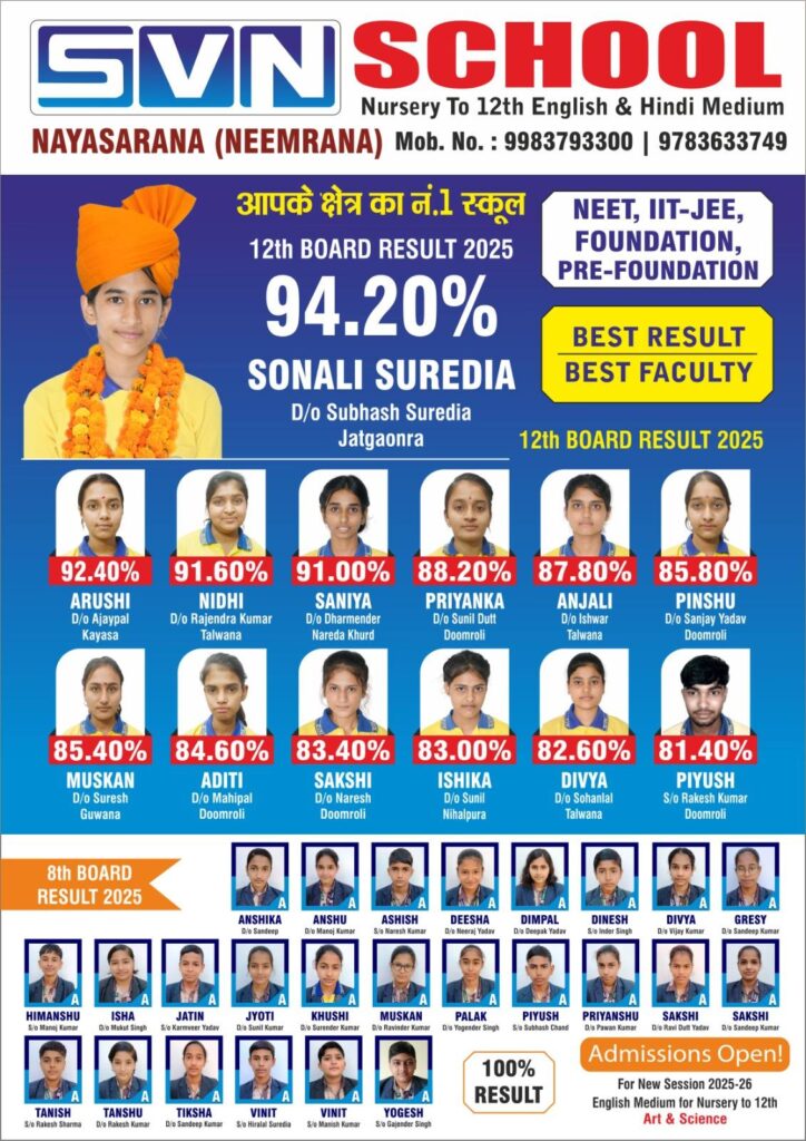 Established in 2003, SVN Senior Secondary School has grown into one of the best schools in Kotputli-Behror, Rajasthan. With over 1000 students, we are committed to delivering quality education aligned with the Rajasthan Board of Education while fostering holistic development.