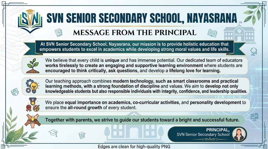 At Swami Vivekanand (SVN) Senior Secondary School, Nayasrana, we are committed to nurturing young minds and shaping them into confident, responsible, and capable individuals. Education, in our view, is not just about acquiring knowledge but about building character, values, and a strong foundation for life.